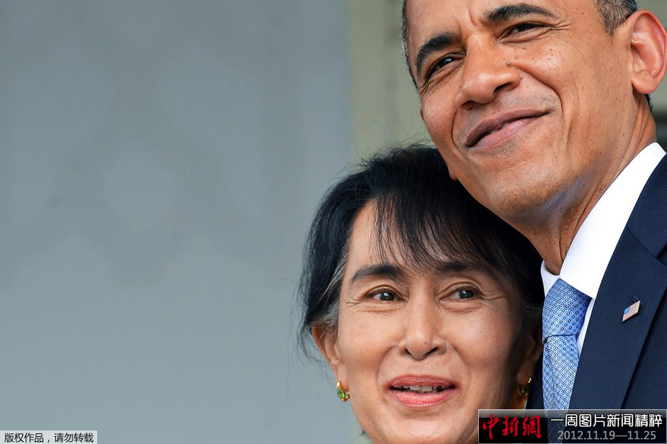 11月18日,美国总统奥巴马(Barack Obama)在出访缅甸仰光时拥抱民主活动人士昂山素季(Aung San Suu Kyi)。奥巴马是首位访问缅甸的在任美国总统。