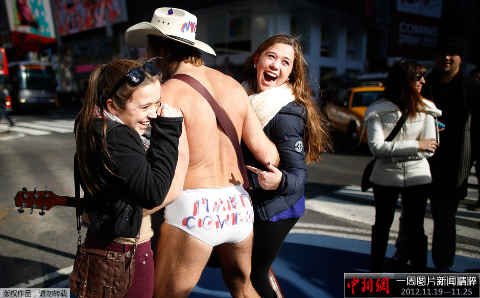 11月23日,是美国传统节日感恩节过后的第一天“黑色星期五”,多个商家在进行一年中最大规模的打折促销,一年一度的圣诞购物旺季的大幕从此拉开。图为在美国纽约时代广场上,一名自称“裸体牛仔”的男子在街头表演,并称为“黑色星期五”提供特殊“服务”——“两瓣屁股只要一瓣的价格”。
