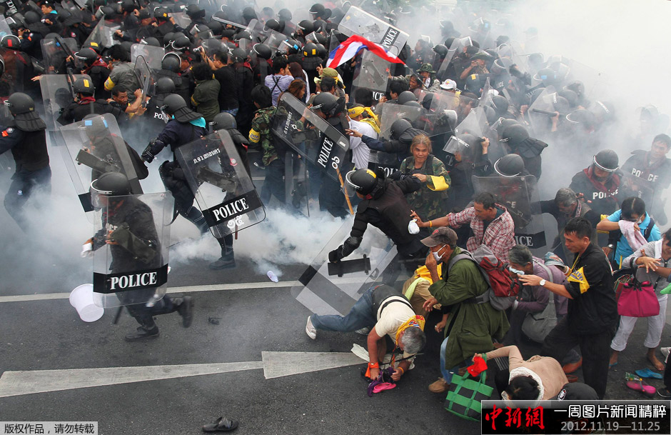 11月24日,泰国曼谷,数百名反对泰总理英拉政府的民众举行示威集会,与警方发生冲突,期间警方发射催泪瓦斯,试图驱散示威活动。