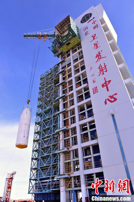 11月25日12时06分,中国在酒泉卫星发射中心用“长征四号丙”运载火箭,成功将“遥感卫星十六号”发射升空并送入预定轨道,这是中国“长征”系列运载火箭第172次航天发射。图为发射前夕,卫星在发射塔架上进行吊装。中新社发 梁杰 摄