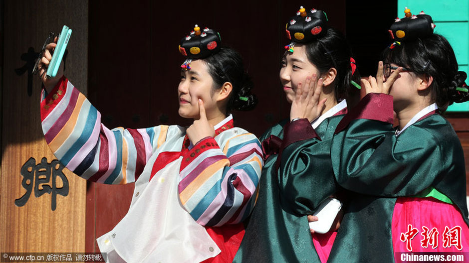 当地时间11月26日,韩国京畿道杨平郡玉泉面杨根乡校,杨根高中高三的女学生们为了参加成人礼穿上了传统韩服,并用手机自拍。图片来源:CFP视觉中国