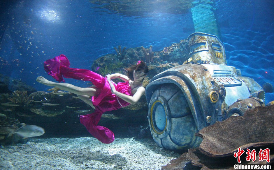 11月26日,武汉极地海洋世界举办粉红丝带活动,3位女性爱心大使,与极地动物亲密接触,在海底展示曼妙身姿,意在宣传关爱女性身体,倡导科学健康的生活方式。中新社发 王振武 摄 图片来源:CNSPHOTO