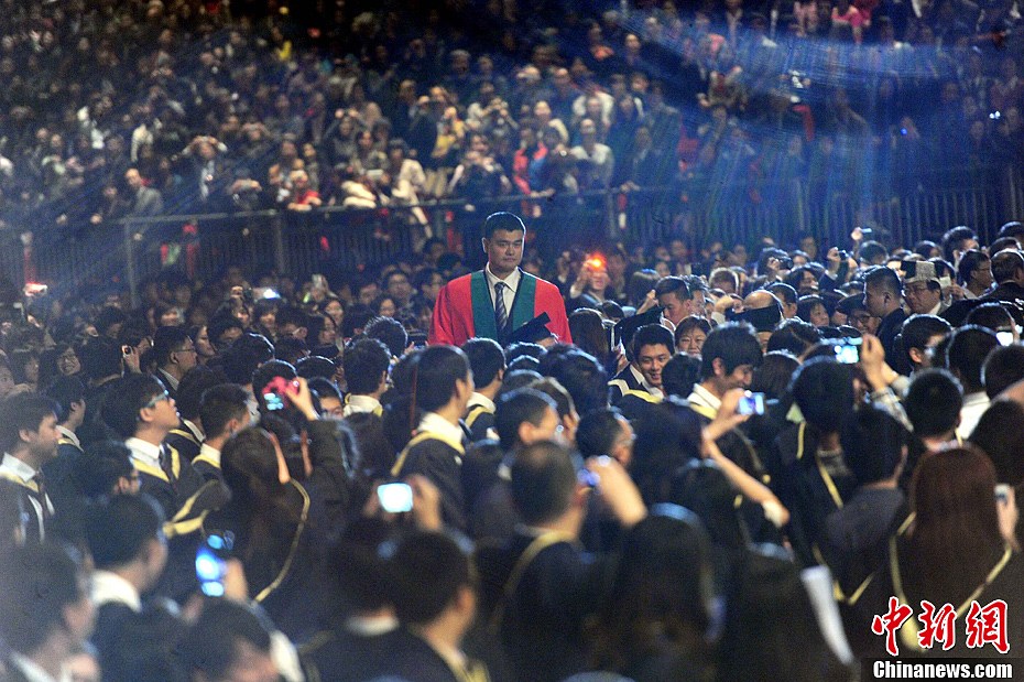 11月27日,身高7呎4吋的姚明,踏入会场已成全场焦点。中国篮球健将姚明荣获香港大学颁授名誉社会科学博士学位。中新社发 谭达明 摄