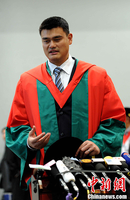 11月27日,中国篮球健将姚明荣获香港大学颁授名誉社会科学博士学位。在仪式结束后的媒体见面会上,姚明难掩激动的心情,他表示港大给予他的荣誉将激励他更加努力。