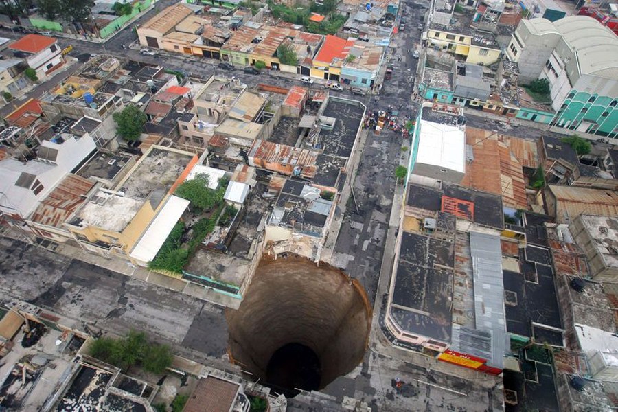 2010年5月31日,危地马拉,热带风暴Agatha袭击危地马拉,地面塌陷形成大坑。图片来源:新华网