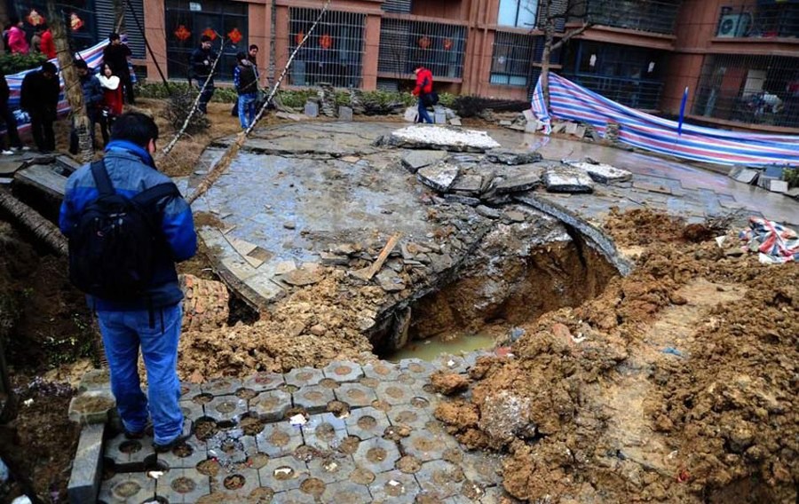 2月29日,安徽合肥市北二环的北环阳光花园小区突然出现地面塌陷。图片来源:新华网