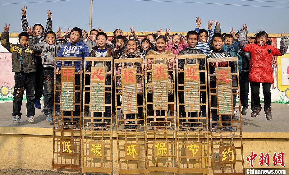 河北省武安市康二城镇中心小学师生们用废纸箱、旧轮胎、旧挂历、酒盒、硬纸板等经过精心设计,变成了一件件创意新颖、式样独特的牌匾,一幅幅精美绝伦的图画,一条条饱含哲理的标语,以及班级名片、门牌号、储物盒、挂钩等班级装饰品,上千件“另类作品”遍及校园各个角落。图为武安市康二城镇中心小学学生们在低碳、环保、节约中享受快乐。马继前 摄