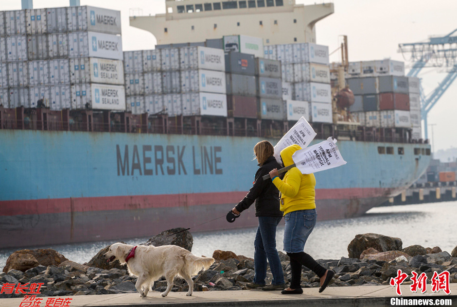 当地時间12月4日,美国加利福尼亚州洛杉矶港,罢工工人们手持着标语牌游行。在洛杉矶港发生2002年以来最大规模罢工。罢工由代表800名文职人员的国际海岸和仓库工会于上周二发起,抗议对象是洛杉矶/长滩港口雇主协会。有一万名码头工人和其他工会组织成员拒绝跨越罢工文职人员所设的纠察线去上班,造成全美最繁忙的货运港口近乎瘫痪。洛杉矶-长滩两个港口的14个集装箱码头中的10个被关闭。罢工造成的经济损失每天高达10亿美元,已经有11艘货船转道其他港口包括墨西哥。中新社发 林戈 摄