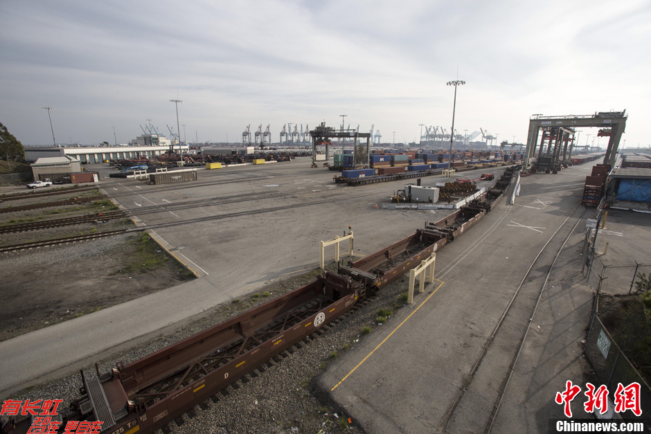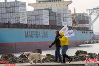 当地时间12月4日,美国加利福尼亚州洛杉矶港,一货柜码头作业完全停顿。在洛杉矶港发生2002年以来最大规模罢工。罢工由代表800名文职人员的国际海岸和仓库工会于上周二发起,抗议对象是洛杉矶/长滩港口雇主协会。有一万名码头工人和其他工会组织成员拒绝跨越罢工文职人员所设的纠察线去上班,造成全美最繁忙的货运港口近乎瘫痪。洛杉矶-长滩两个港口的14个集装箱码头中的10个被关闭。罢工造成的经济损失每天高达10亿美元,已经有11艘货船转道其他港口包括墨西哥。中新社发 林戈 摄