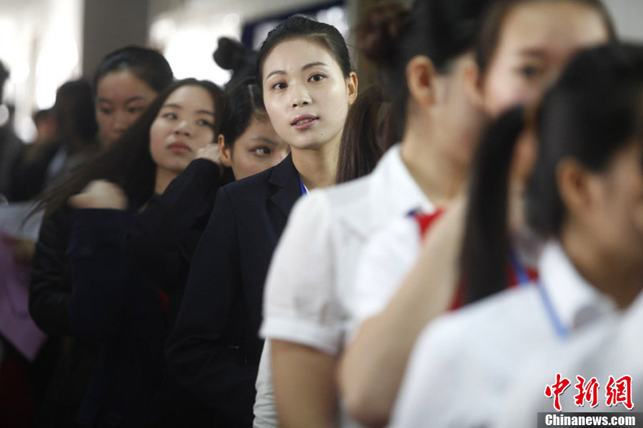 12月6日,深圳职业技术学院西校区,形象高雅靓丽的美女有序等候进入南航乘务员招聘现场。据悉南航此次招聘,承诺入职后正常参加飞行的乘务员,一年内收入可达6-8万元,1年后年收入可达15万元左右。图片来源:东方IC 版权作品 请勿转载