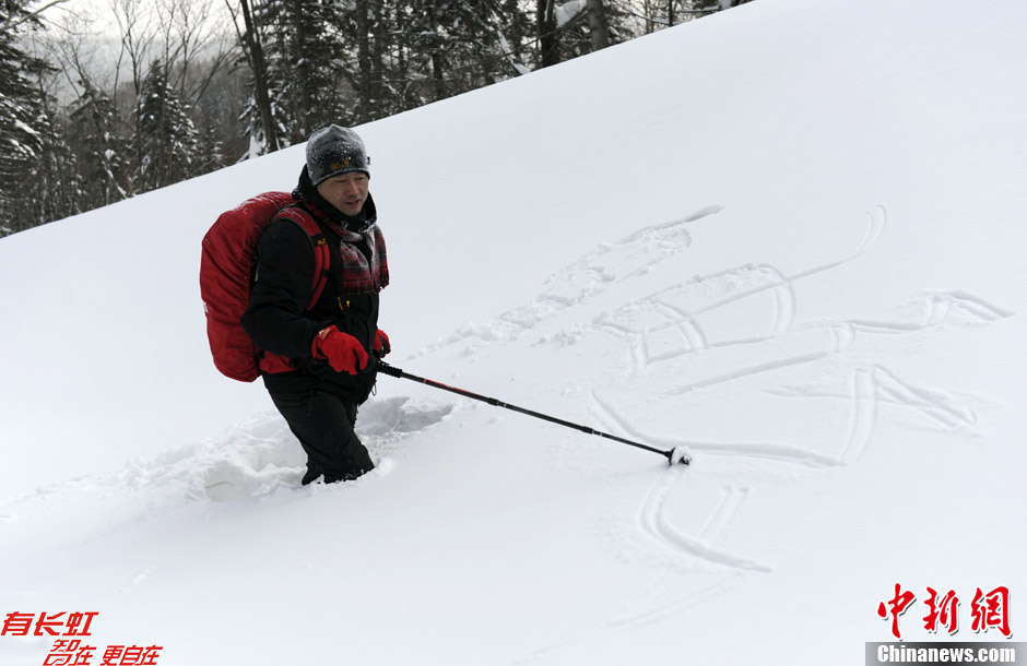 近日,黑龙江省连降瑞雪,白雪皑皑的黑龙江雪谷迎来无数游客来此赏雪玩雪。雪谷位于林海雪原之北,在黑龙江省五常市东升林场境内,由于地理位置特殊,具有雪量大,雪质好,雪期长的特点,并有“夏无三日晴,冬雪接长天”之说。图为游客在雪地上用登山杖留字“自由行”。中新社发 刘长山 摄