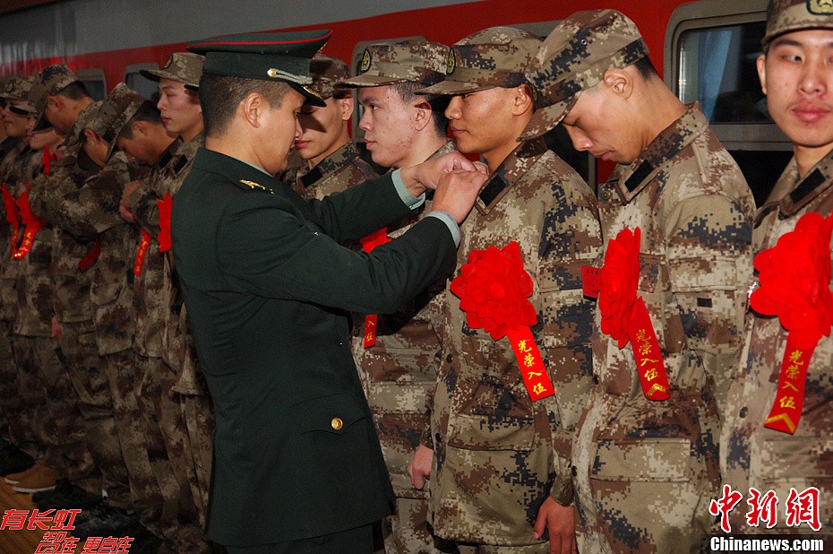 12月10日,在福州火车站,520名新兵将赴浙江等地军营,开始自己的军旅生涯。据了解,福建省今年征集近1万5千名新兵奔赴海军、空军、及部分军区和武警部队,其中,两成是在校大学生或刚大学毕业的适龄青年。图为入伍新兵准备上火车。中新社发 吕明 摄