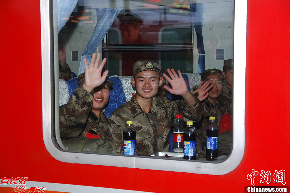 12月10日,在福州火车站,520名新兵将赴浙江等地军营,开始自己的军旅生涯。据了解,福建省今年征集近1万5千名新兵奔赴海军、空军、及部分军区和武警部队,其中,两成是在校大学生或刚大学毕业的适龄青年。图为新兵挥手告别。中新社发 吕明 摄