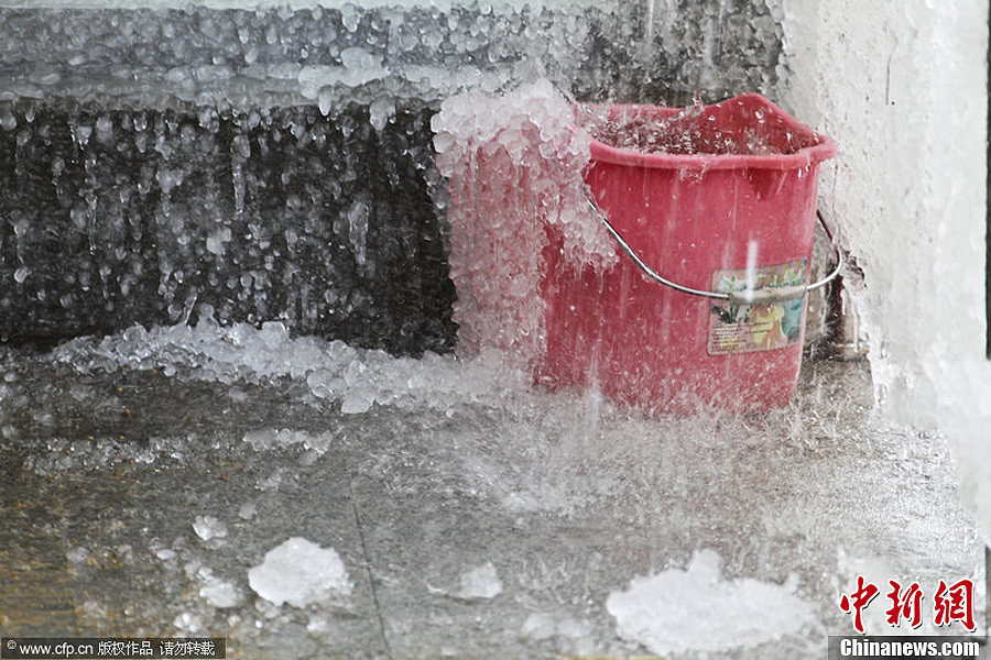 “早上起床,我还以为自己在东北。”2012年12月9日,山东青岛浦口路与威海路交会处,一栋楼前台阶上厚厚的冰层和栅栏上挂着的冰凌,让居民出现了“错觉”。相关人员将台阶上的冰铲除,但清水不断从楼上的下水管流出,流到台阶上再次结冰。对此,物业人员称是楼上水塔漏水,已经有人员进行处理。图为12月10日,山东青岛浦口路与威海路交会处,水不停的流下,并迅速结冰。孙传浩 摄 图片来源:CFP视觉中国