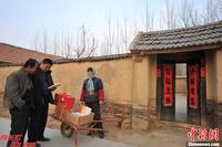 12月10日,往日平静的山东省高密市大栏乡太平庄因莫言获得2012诺贝尔文学奖突增无限商机,紧邻莫言旧居的几间破落民居被“聪明”的商家高价租用,莫言旧居成为村民兜售莫言文集的“金字招牌”。图为参观者选购莫言文集。中新社发 张勇 摄