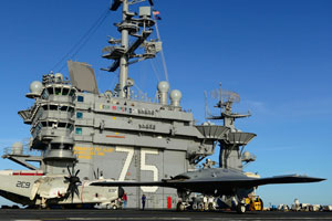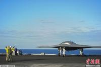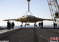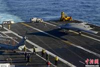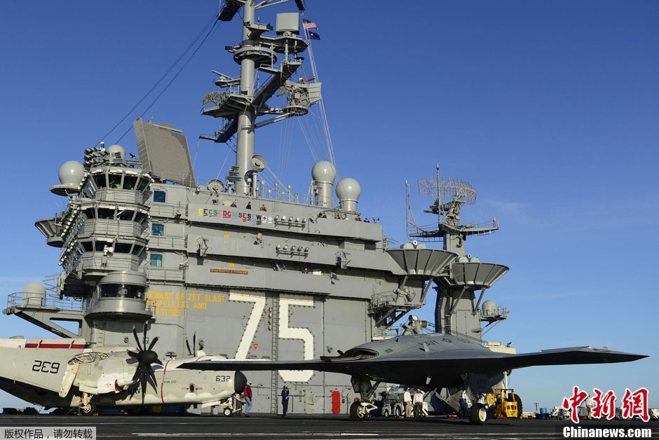 美海军新型无人机X-47B在航母上进行甲板操作试验