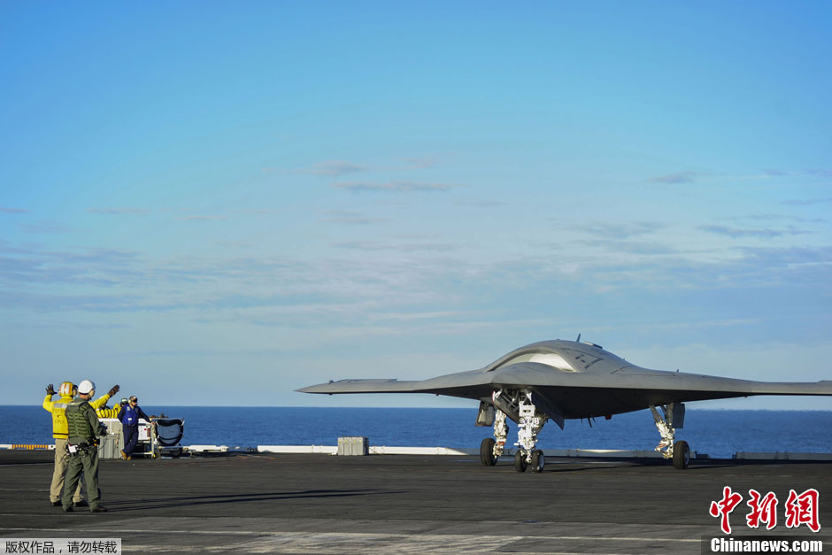 美海军新型无人机X-47B在航母上进行甲板操作试验