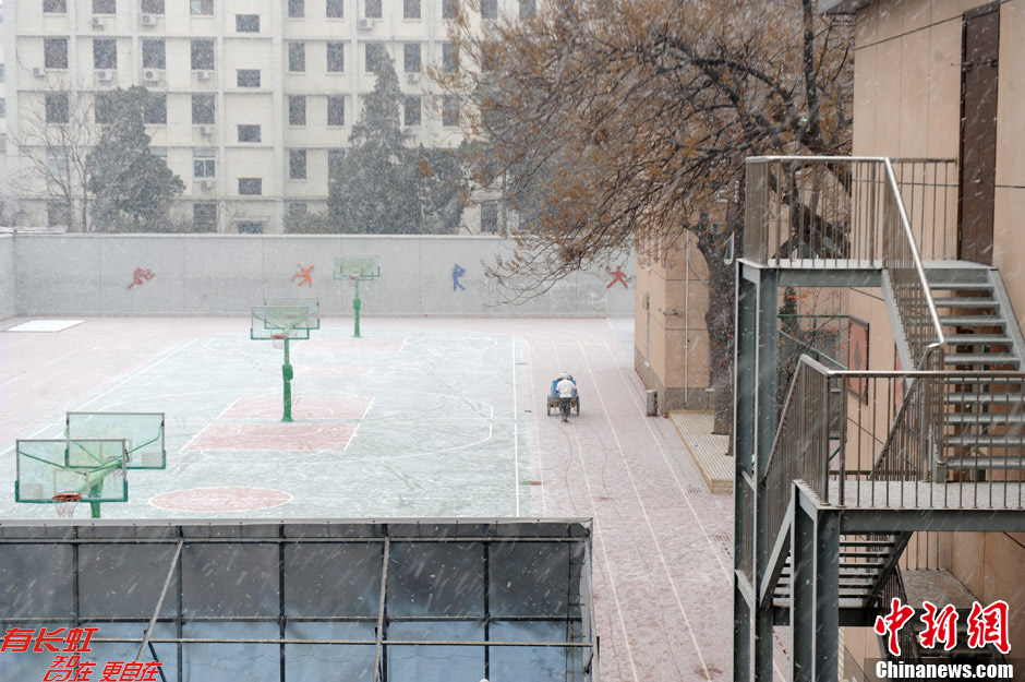 2012年12月12日,北京天空阴沉,城区内部分地区有雪花飘落,7时气温在-4℃左右,感觉较为阴冷。图为雪中行人。中新网记者 张龙云 摄