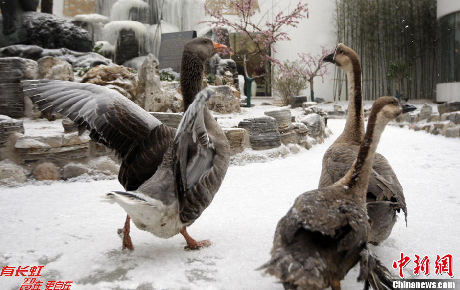 12月12日,清晨北京城区飘起雪花,一群在城市花园里散养的鹅在踏雪嬉戏觅食。中新社发 杨可佳 摄