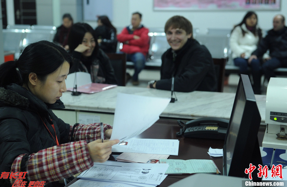 2012年12月12日,因3个“12”凑一起,被年轻人称为“示爱吉祥日”,成都市的青羊区、武侯区、锦江区、高新区等地的民政局婚姻登记处迎来结婚登记高峰。拍结婚照、登记纪念照处排起长队热闹非凡。图为四川省民政厅婚姻登记处也迎来不少涉外婚姻登记。中新社发 刘忠俊 摄