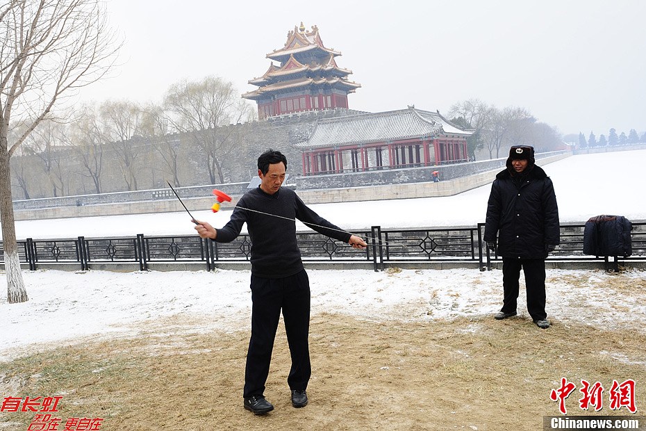 12月12日,从当日清晨开始,北京开始今冬第二场降雪过程。据北京市气象局消息,当日降雪于中午前后逐渐停止,预计北京城区极有可能将在13日再度迎来一场较大的降雪过程,降雪量或将至2—4毫米,达中雪量级。图为一名不畏寒冷的市民在北京故宫角楼外抖空竹。中新社发 崔楠 摄