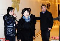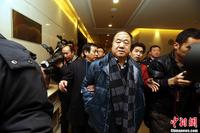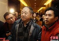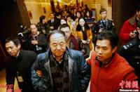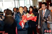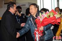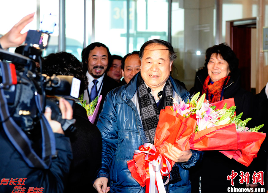 12月14日上午,2012年诺贝尔文学奖得主莫言(中)参加完颁奖典礼后乘飞机返回北京,在北京首都机场受到热烈欢迎。中新社发 侯宇 摄