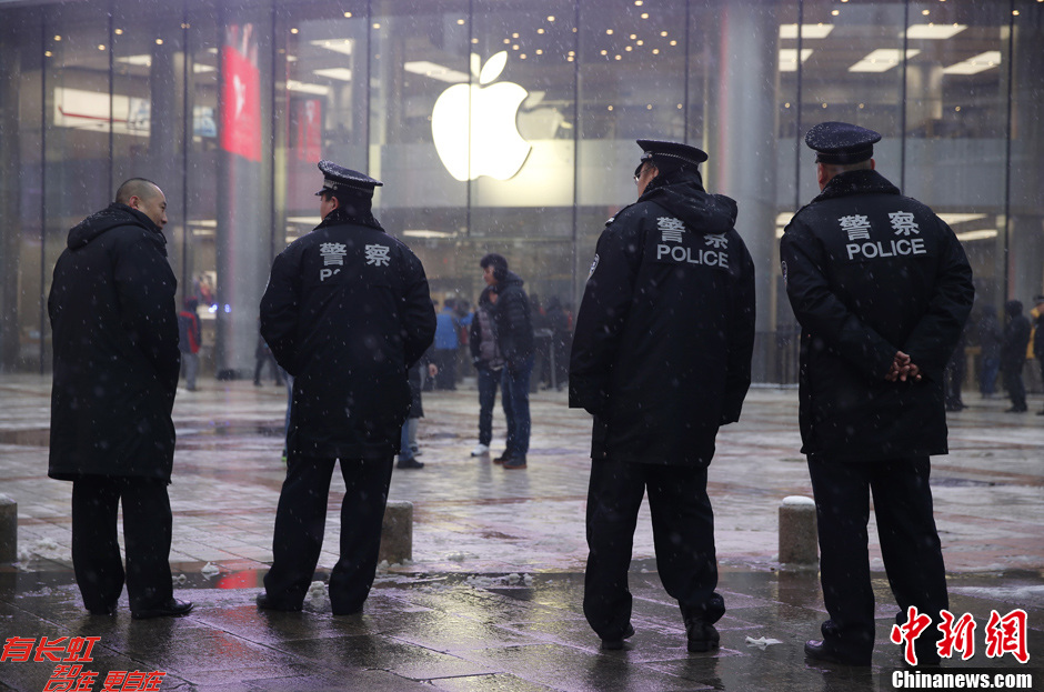 12月14日清晨,警方在北京王府井的苹果专卖店外执勤。由于预订顾客取机时间被错开,专卖店门口并没有形成排队的现象。12月14日零时,苹果iPhone 5智能手机在中国内地正式上市,位于王府井的直营店则在8点开门迎接之前在网上预订的顾客。中新社发 刘关关 摄
