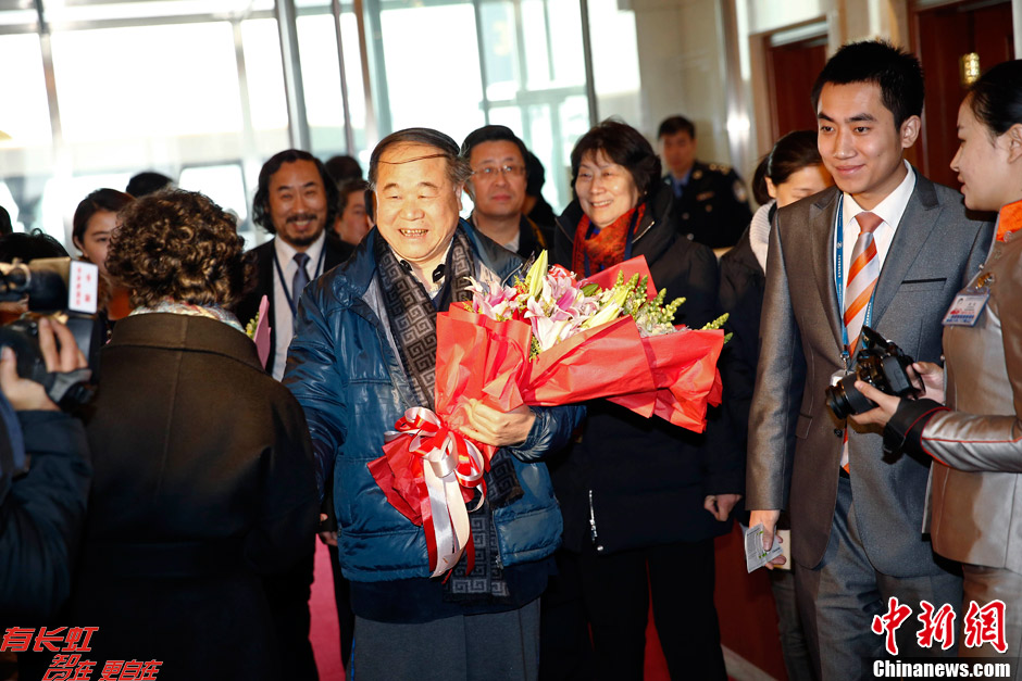 12月14日上午,2012年诺贝尔文学奖得主莫言参加完颁奖仪式后返回北京,大批媒体记者和欢迎人群在首都机场迎接莫言归来。中新社发 张浩 摄