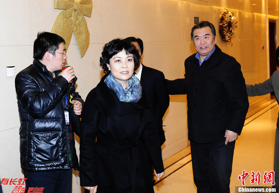 12月14日,中国作家协会主席铁凝(中)在北京首都国际机场迎接2012年诺贝尔文学奖得主莫言领奖归来。中新社发 张浩 摄