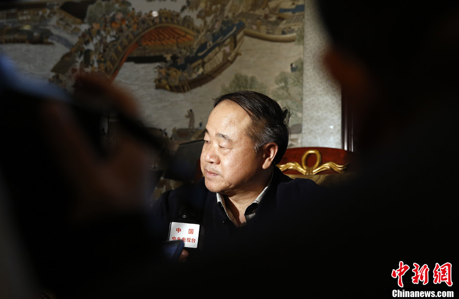12月14日上午,2012年诺贝尔文学奖得主莫言参加完颁奖典礼后乘飞机返回北京,并在首都国际机场贵宾室举行简短记者会,图为他在贵宾室时接受媒体采访。中新社发 张浩 摄