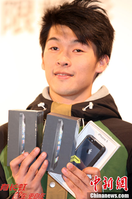 12月14日,苹果iPhone5在台北信义区首卖,台北青年卢旗彻夜排队15个小时以上、抢得台湾中华电信“头香”,意外免费获赠一台新机。卢旗表示,15日是他妈妈生日,他将把一台iPhone5送给妈妈,另一台自用。中新社发 董会峰 摄