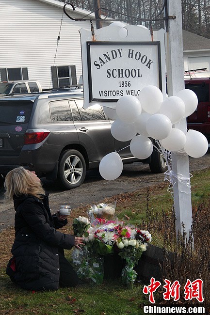 当地时间12月15日,民众获准到此前被警方重重封锁的美国康涅狄格校园枪击案案发地——桑迪胡克小学校门口进行哀悼,案发地的哀悼活动由此展开。14日桑迪胡克小学遭遇枪击事件,造成惨重人员伤亡,震惊全世界。中新社发 李洋 摄