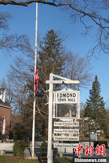 12月15日,康涅狄格纽敦当地政府降半旗,为枪击案死难者致哀。中新社发 李洋 摄