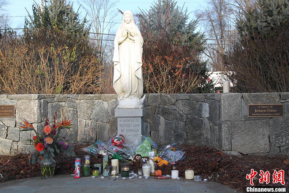 12月15日,美国康涅狄格纽敦教堂圣母像前摆满了各种纪念物品,寄托人们对枪击案死难者的哀思。中新社发 李洋 摄