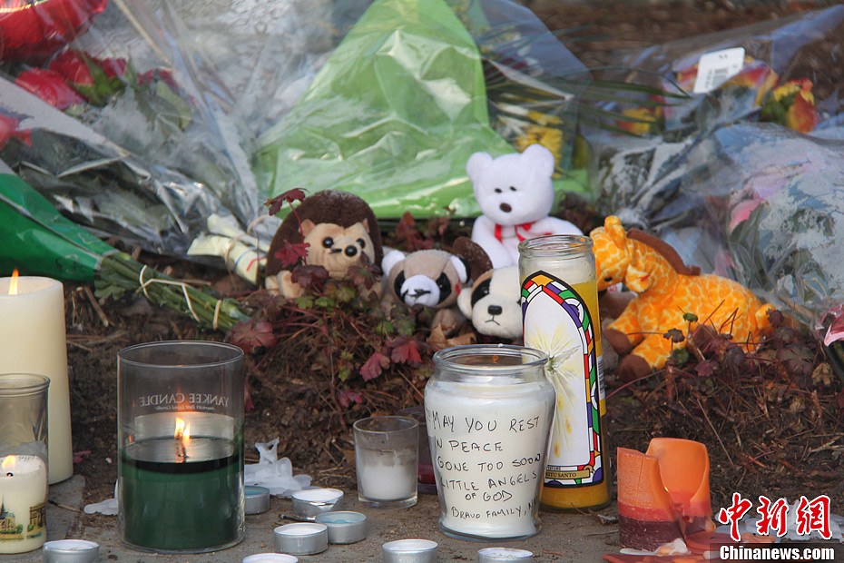12月15日,康涅狄格纽敦的教堂前摆放了各种玩具,寄托人们对枪击案死难儿童的哀思。在14日发生的枪击案中,大部分死难者都是儿童。中新社发 李洋 摄