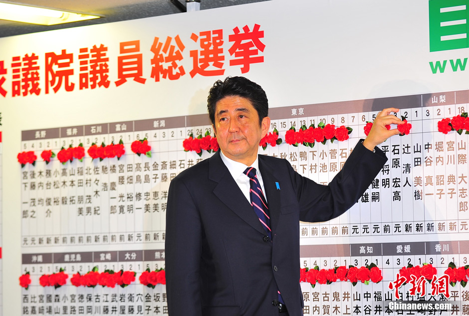 12月16日进行投票选举的日本第46届众议院大选,虽然最终选票结果要于17日凌晨统计完毕,但自民党单独获得众议院半数席位已经意味着将重新执政,而自民党总裁安倍晋三将成为日本新首相。 中新社发 孙冉 摄