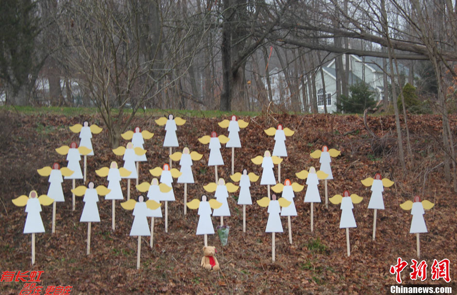 12月16日,美国康涅狄格为纽敦桑迪胡克小学枪击案遇害者展开大规模的悼念活动,27个天使像在枪击案发生地附近竖立,象征着27名枪击案中的遇害者。中新社发 李洋 摄