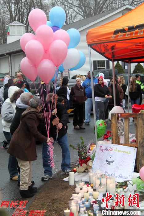 12月16日,美国康涅狄格为纽敦桑迪胡克小学枪击案遇害者展开大规模的悼念活动,桑迪胡克小学校门口堆满了各种纪念品和蜡烛,寄托人们的沉痛哀思。枪击案导致27人被杀,其中包括20名儿童,枪手自杀身亡。中新社发 李洋 摄