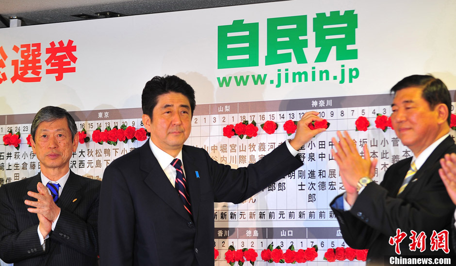 12月16日进行投票选举的日本第46届众议院大选,虽然最终选票结果要于17日凌晨统计完毕,但自民党单独获得众议院半数席位已经意味着将重新执政,而自民党总裁安倍晋三将成为日本新首相。图为12月16日,自民党总裁安倍晋三(中)为当选议员贴获胜标志红花。中新社发 孙冉 摄