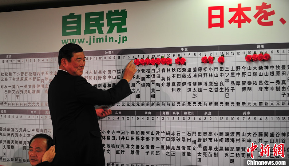 12月16日进行投票选举的日本第46届众议院大选,虽然最终选票结果要于17日凌晨统计完毕,但自民党单独获得众议院半数席位已经意味着将重新执政,而自民党总裁安倍晋三将成为日本新首相。图为自民党干事长石破茂在给获选议员贴获胜标志红花。中新社发 孙冉 摄