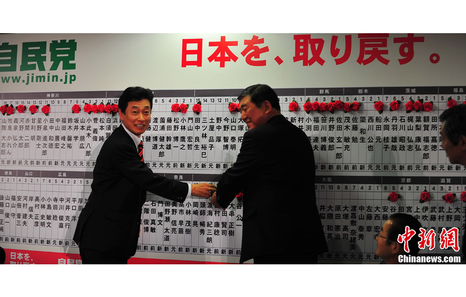 12月16日进行投票选举的日本第46届众议院大选,虽然最终选票结果要于17日凌晨统计完毕,但自民党单独获得众议院半数席位已经意味着将重新执政,而自民党总裁安倍晋三将成为日本新首相。图为自民党干事长石破茂在给获选议员贴获胜标志红花。中新社发 孙冉 摄