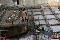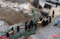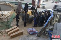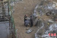 12月18日清晨,位于山西太原龙堡村村口的“最牛钉子坟”在矗立3年之后,今日开始动迁。经过4个小时的挖掘,孤坟迁移完成,家属告诉记者4具棺椁将重新安葬。图为帮忙的亲属们向外运送棺椁。