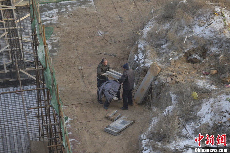 12月18日早晨,山西太原龙堡村村口的龙园小区工地,坟主带着村里的30余名老乡来到工地,通过事先搭好的平台将祖坟内的四具遗体抬走。据了解,在最终与村里达成共识的情况下,坟主得到规定的赔偿将坟迁走。图片来源:CFP视觉中国