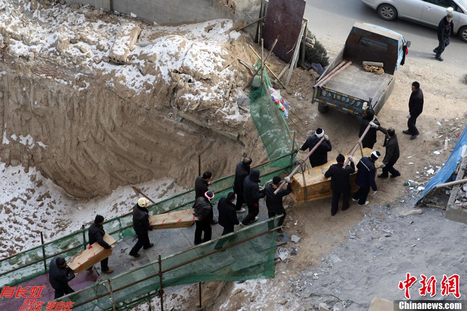 12月18日清晨,位于山西太原龙堡村村口的“最牛钉子坟”在矗立3年之后,今日开始动迁。经过4个小时的挖掘,孤坟迁移完成,家属告诉记者4具棺椁将重新安葬。图为帮忙的亲属们向外运送棺椁。张云 摄