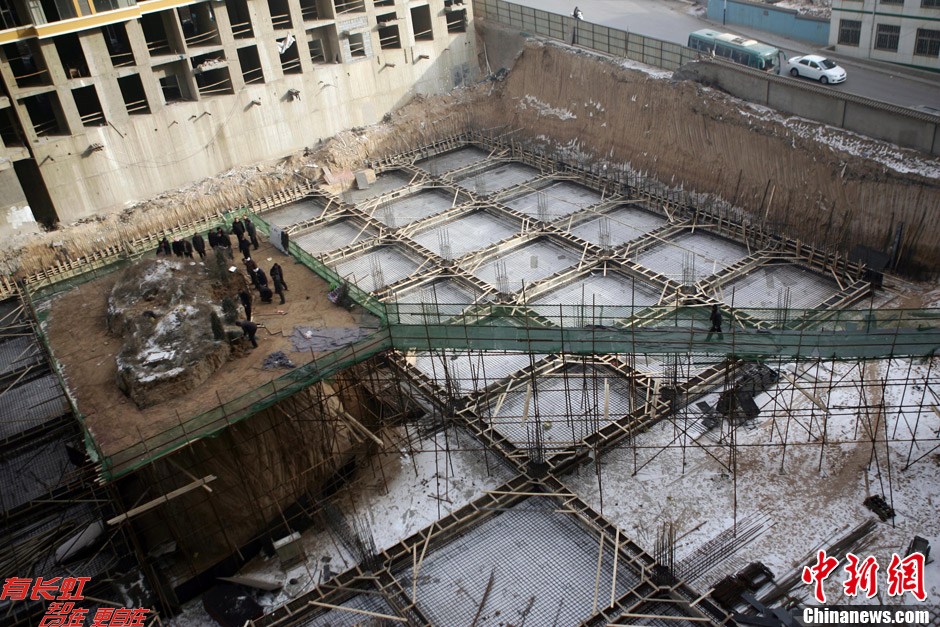 12月18日清晨,位于山西太原龙堡村村口的“最牛钉子坟”在矗立3年之后,今日开始动迁。经过4个小时的挖掘,孤坟迁移完成,家属告诉记者4具棺椁将重新安葬。张云 摄