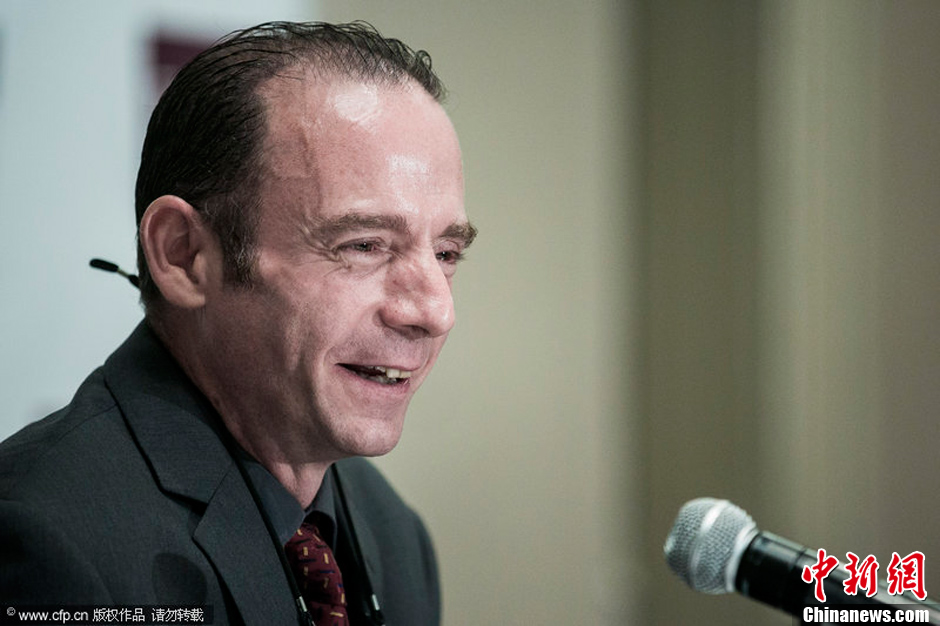 47岁的布朗曾经被艾滋病纠缠了整整10年,2007年以来,布朗接受了两次骨髓干细胞移植,此后便一直对艾滋病病毒检测呈阴性,这令苦苦找寻艾滋病疗法的医学界着实兴奋,科学家希望通过细胞移植或基因疗法研究,开辟艾滋病治疗新途径。图为当地时间2012年7月24日,美国华盛顿,被称为“柏林病人”的蒂莫西•雷•布朗(Timothy Ray Brown)召开新闻发布会,宣布成立以他的名字命名的基金会,推动艾滋病治疗研究。