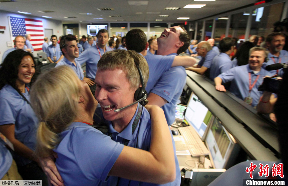 2012年8月6日1时31分(北京时间13时31分),美国“好奇”号火星探测器登陆火星,这是探索火星可能存在生命这一使命的最重要步骤。作为这一重要项目中参与并见证的一员,nasa员工们激动之情已然溢于言表了。图为美国加利福尼亚州帕萨迪纳市航空控制中心内,工作人员在收到“好奇”号传回的第一张图像后庆祝。
