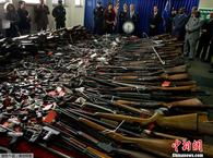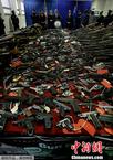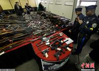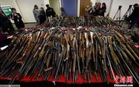 当地时间2012年12月18日,美国新泽西州Camden,桌子上放着回收的枪支。美国新泽西州司法部长Jeffrey Chiesa宣布上周末的枪支回收活动总共收到超过1100把枪。他表示康州小学枪击案在某种程度上推动了人们上交自己手中的武器。