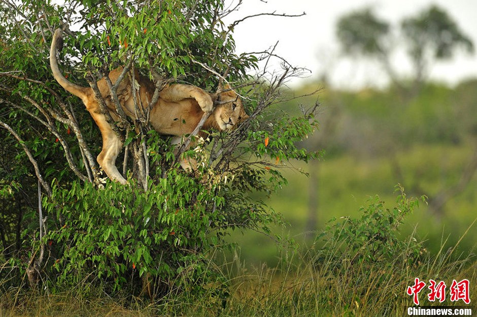当地时间2012年10月28日,肯尼亚Masai Mara国家公园内,一直狮子被卡在树上。这里的消防员经常会解救那些被卡在树上的大猫们,不过这一只可能是他们不愿意遇到的。这只年轻的狮子和朋友们一起玩耍时跳上了树,不过它忘了自己的“身材”没想象中那么苗条,于是很不幸地被卡在树枝中间。狮子拼命挣扎希望能摆脱这种困境,最后却摆出了搞笑的姿势。不过幸运的是,这只狮子发现自己被卡的位置十分“优越”,不仅能够好好休息,还能远眺地面的美丽风光。图片来源:东方IC 版权作品 请勿转载