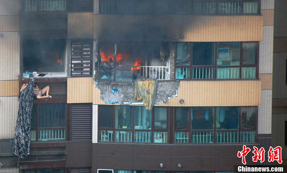 2012年7月18日上午9点30分左右,北京市丰台区赵公口桥一住宅楼8层发生火灾,室内设施付之一炬,屋内一对身着睡衣的男女仓皇逃生,顺着床单下至8层窗檐下一隔断处躲避。事发后消防员赶到将火扑灭,两人搭乘云梯回到地面,随后被送医救治,所幸均无大碍。高志强 摄 图片来源:东方IC 版权作品 请勿转载